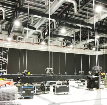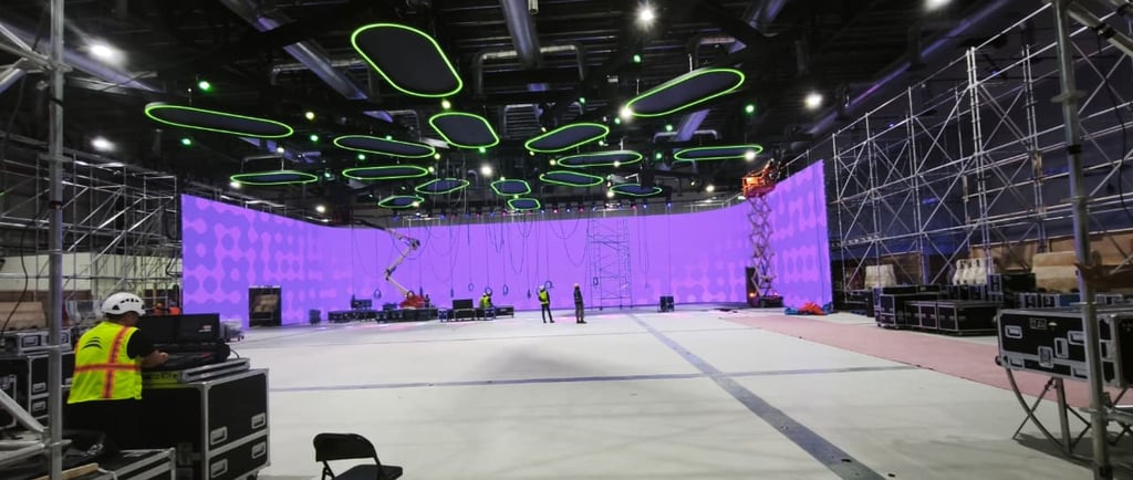 Our team installed massive, seamless curved LED walls that served as the backdrop for all main stage events. The vibrant purple and green branding colours ensured a modern, engaging visual identity. The sheer scale of the setup required meticulous planning and execution by our "A-Team," ensuring every piece of scaffolding and AV equipment was perfectly placed and safety checked.